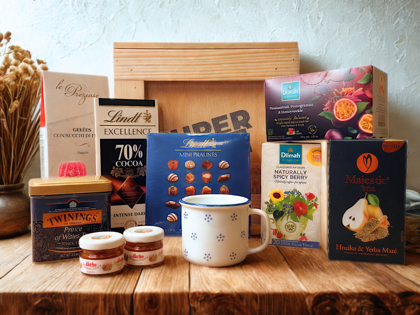 Táto elegantná darčeková debna je ako stvorená pre všetkých, ktorí si radi užijú chvíľku pokoja s šálkou kvalitného čaju a niečím sladkým na zahryznutie. Nájdete v nej prémiový výber čajov z celého sveta, výborné čokolády, delikátne sladkosti aj krásny hrnček, ktorý dotvára celý zážitok. Ideálny darček pre ženy, mamičky, kolegyne, babičky aj tých, ktorí milujú oddych, pohodu a skvelé dobroty.